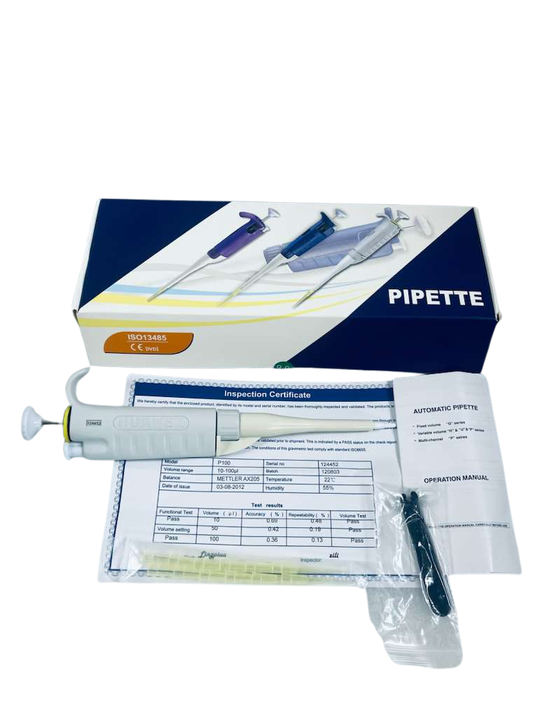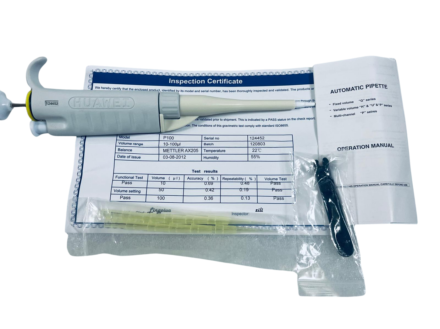 It comes with an inspection certificate, including all the details, as well as a bag of pipette tips and a small tool (you could see all of these in the pictures). All of this is included.