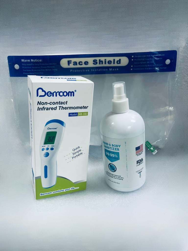1 Face shield + Alcohol Free Hand & Body Sanitizer + 1 Thermometer= $19